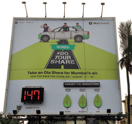 Ola aims to make commuting more affordable for passengers by letting them share rides with other passengers. Furthermore, Ola, which is Uber’s biggest competitor in India, came up with a competition among its users to motivate reduced CO2 emissions. By installing billboards at some prominent junctions, three cities displayed their carbon emissions saved by shared rides. Ola Share users in Delhi, Mumbai, and Bengaluru competed against each other to be the first city to reduce more than 400 tons of CO2 emissions between 3 and 15 August 2016.
