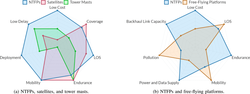 Comparisons among NTFPs and other flying platforms and communications infrastructures.